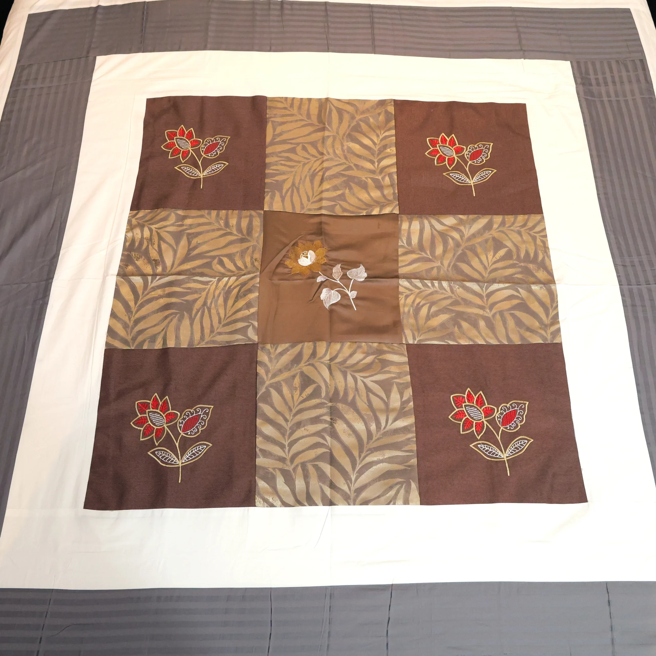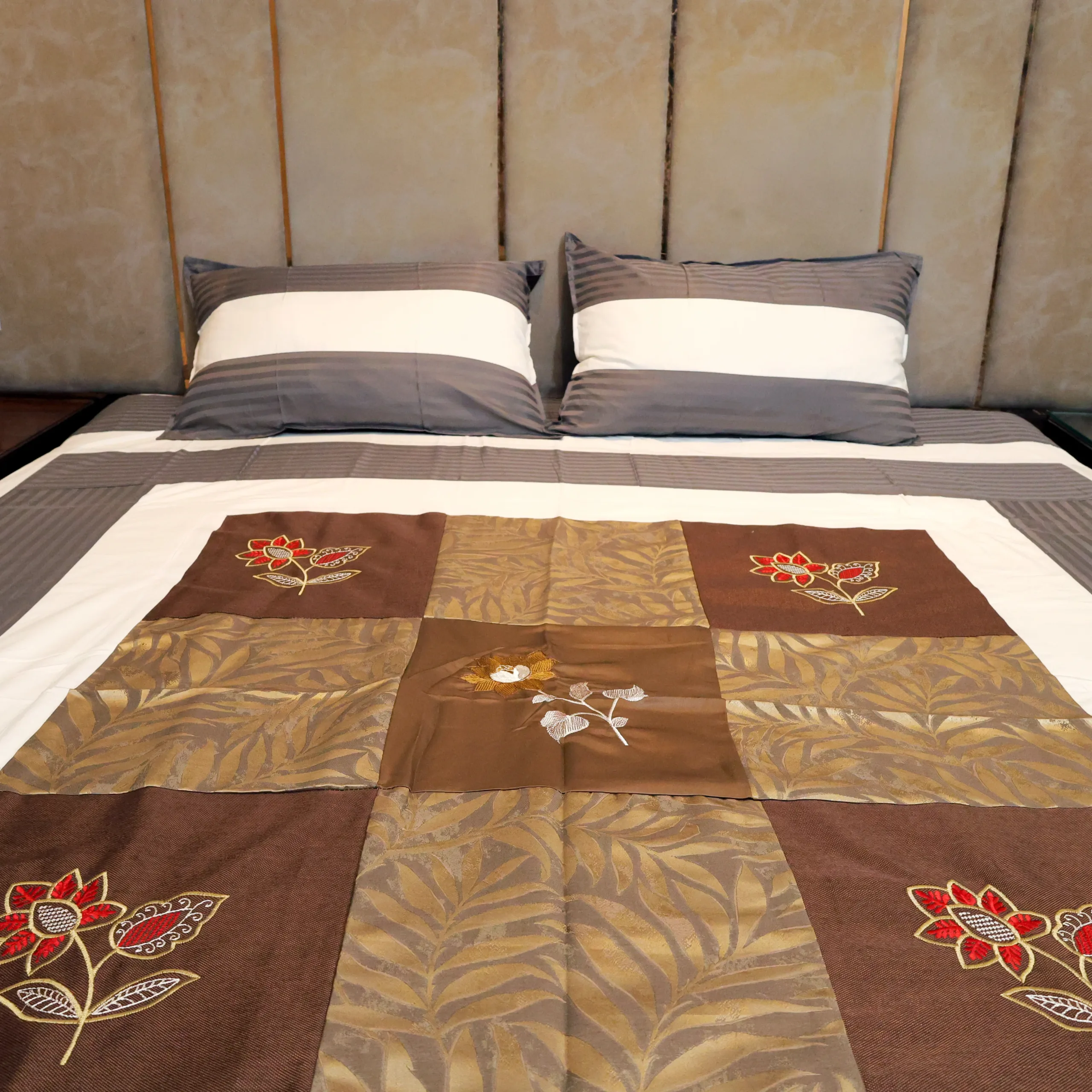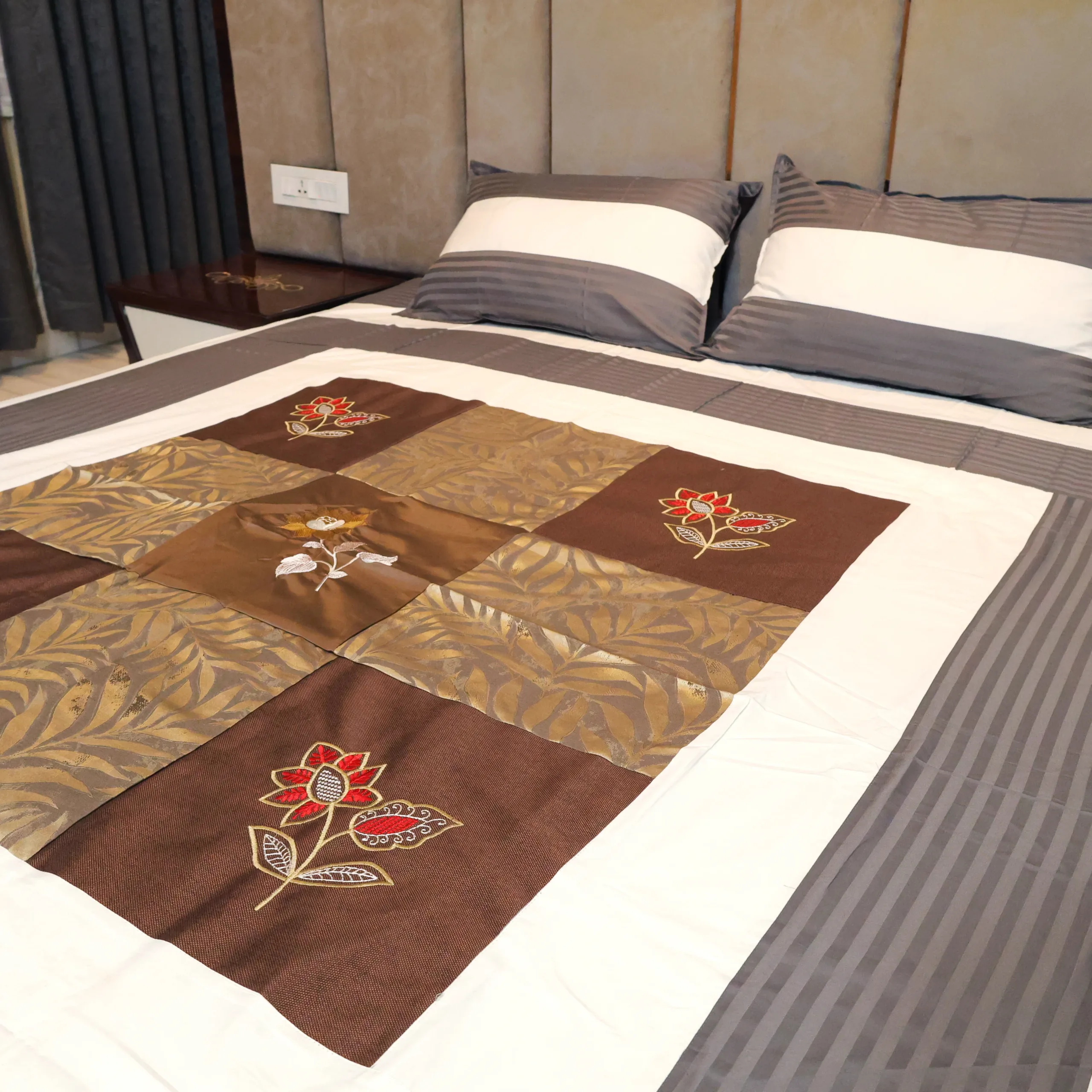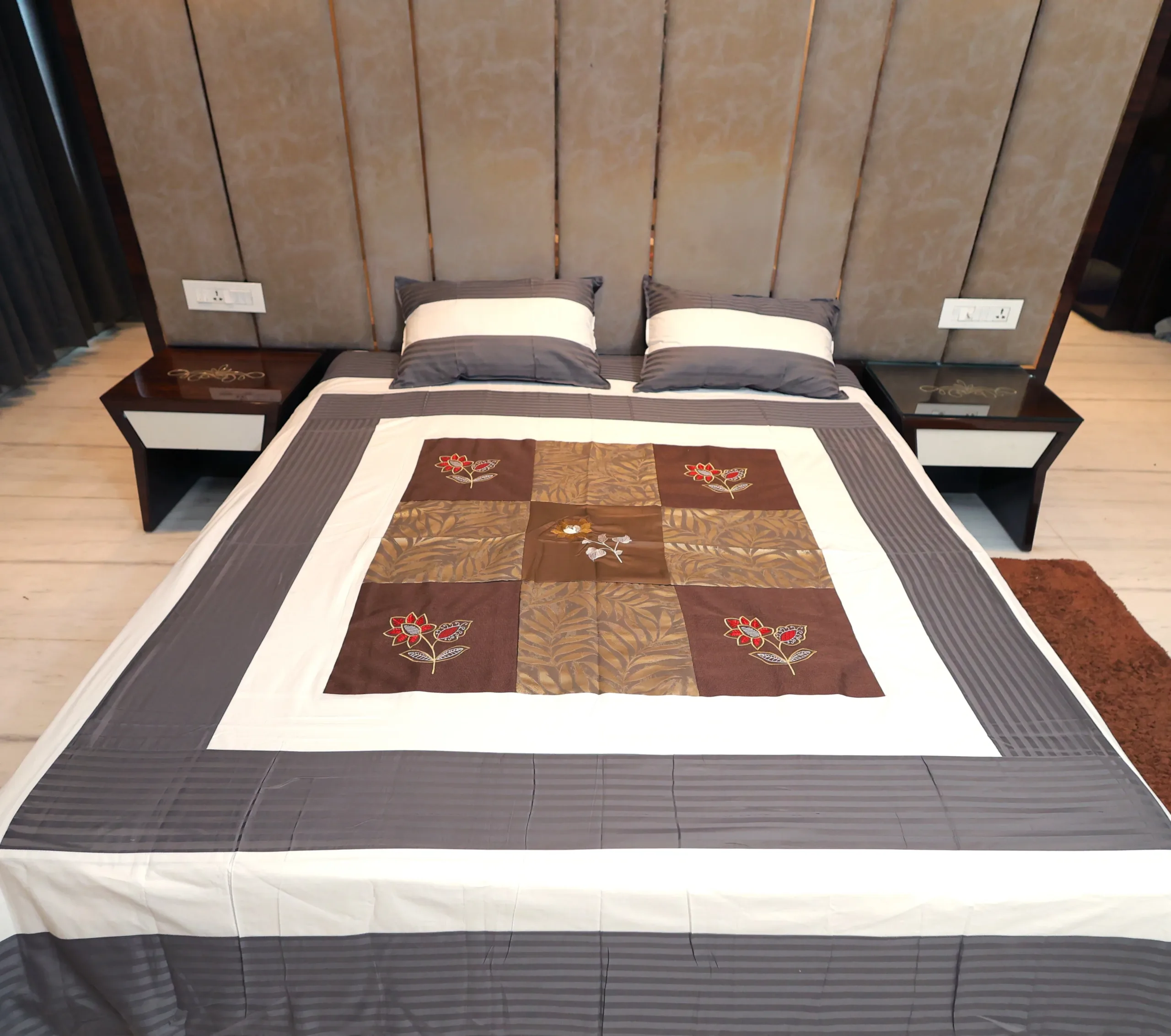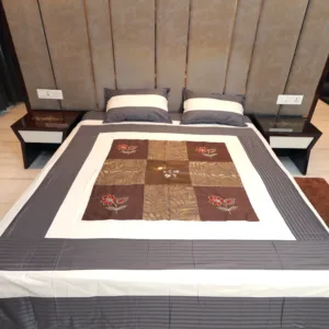 Enhance your bedroom with our elegant cotton bedsheet, featuring a beautifully embroidered floral and jacquard pattern at the center. The warm design in brown is complemented by light contrasting hues along the edges, creating a rich and sophisticated look. Crafted from premium cotton, this bedsheet exudes festive charm, making it ideal for special occasions or adding a touch of luxury to your everyday decor.