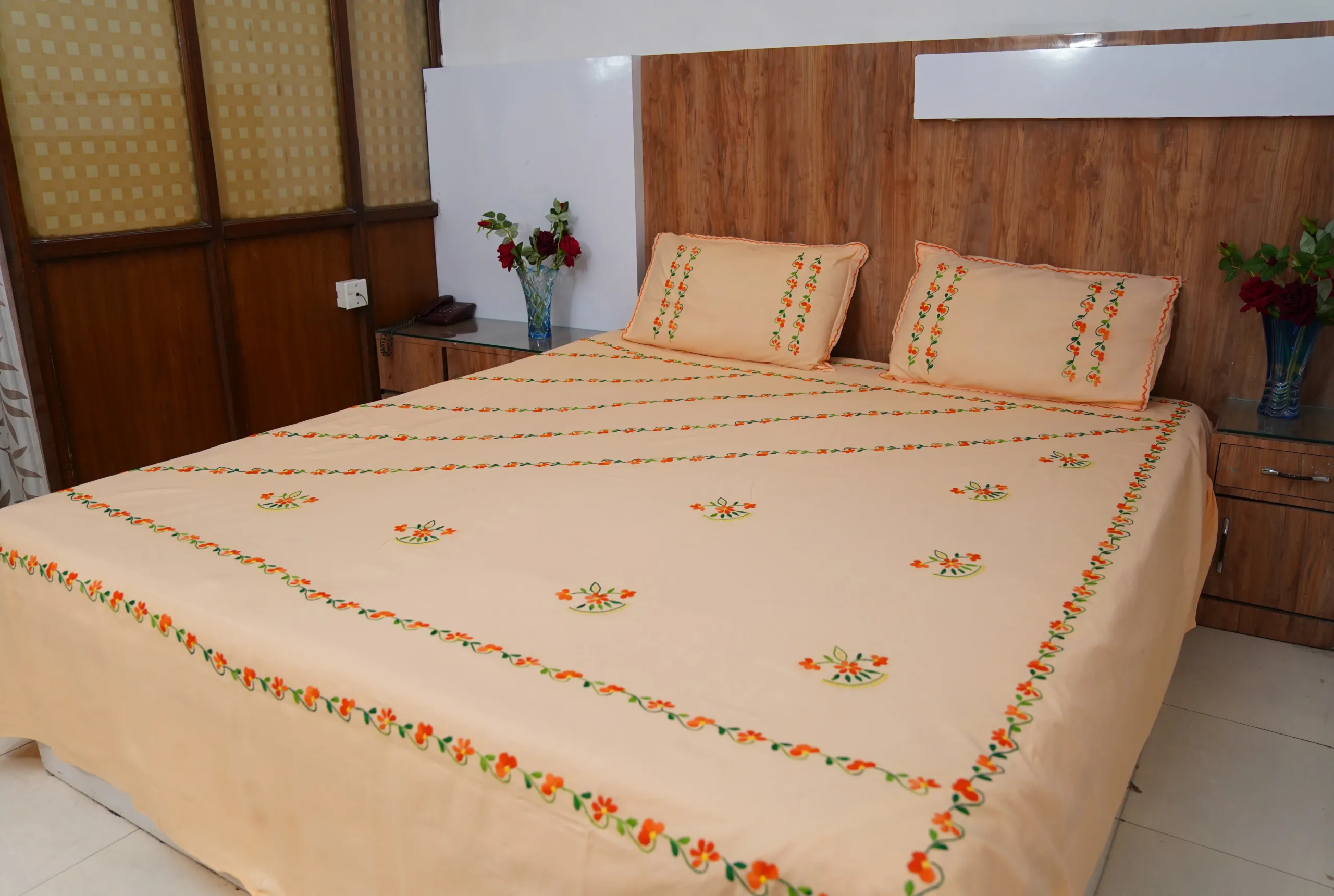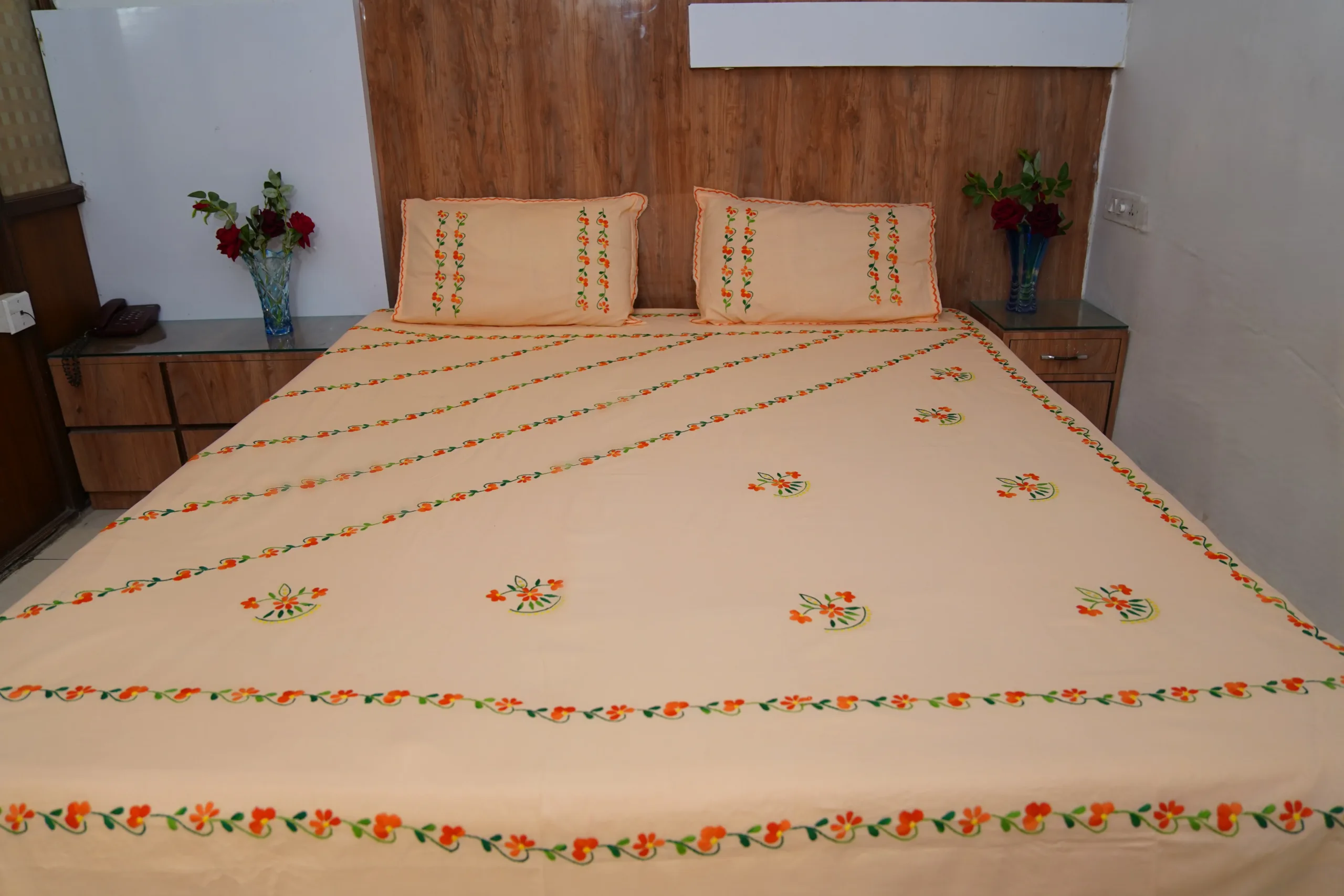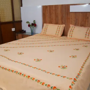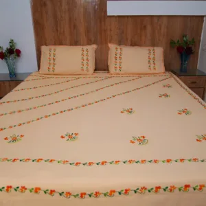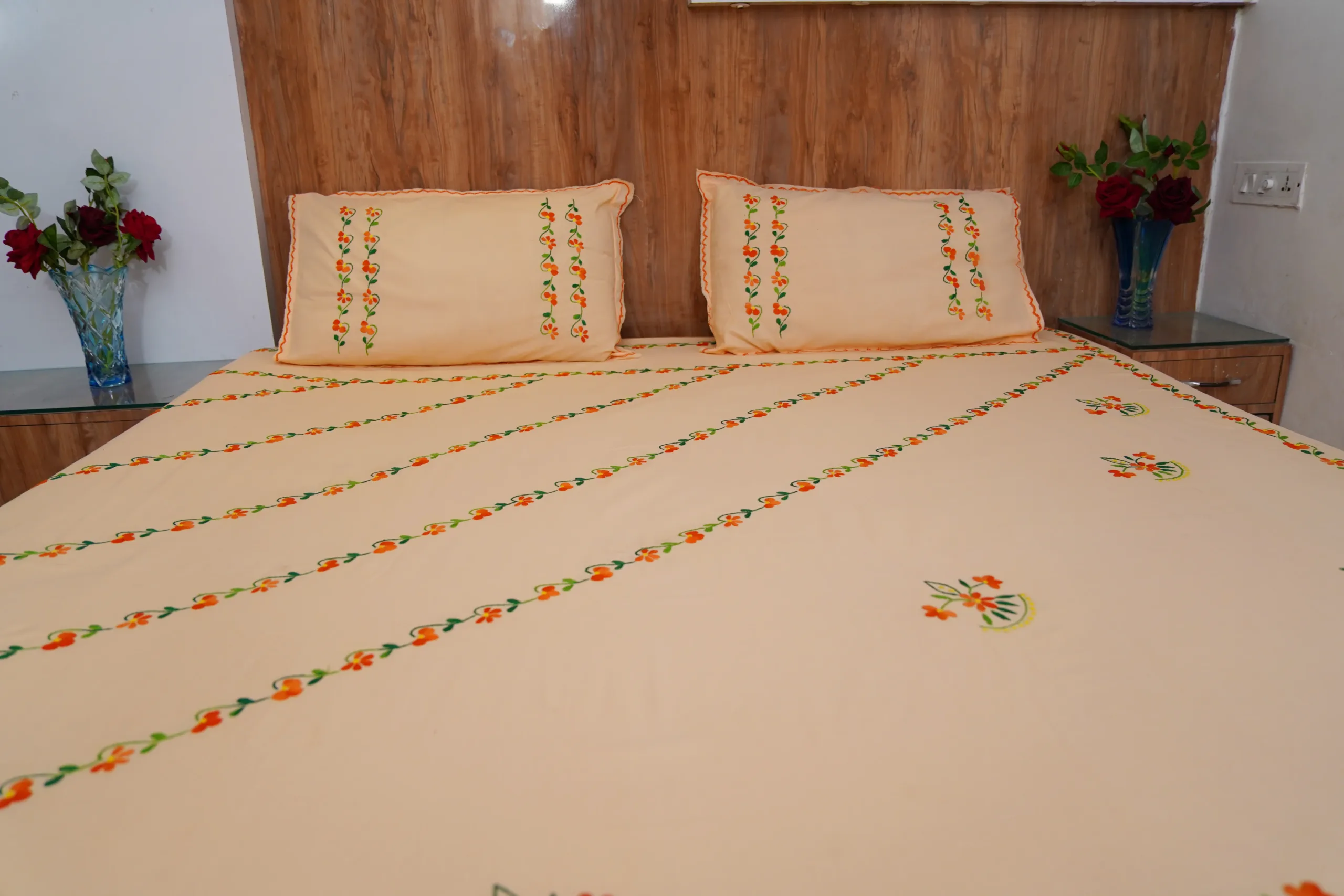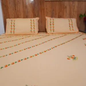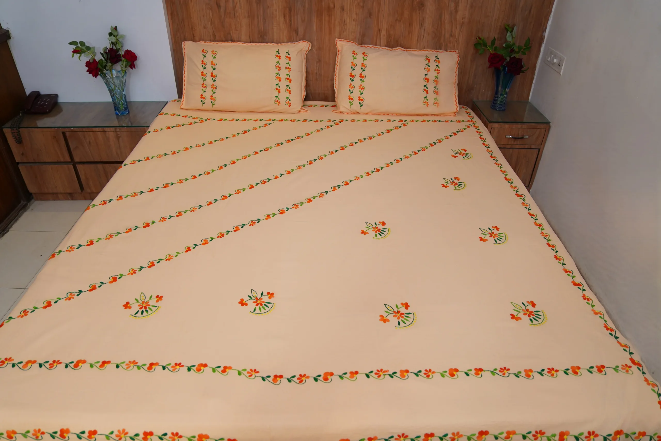 Elevate your bedroom decor with our Handwork premium orange cotton bedsheet, beautifully adorned with all-over orange floral embroidery. Perfect for daily use and special occasions, it adds a touch of sophistication while creating a bright and lively ambiance.
