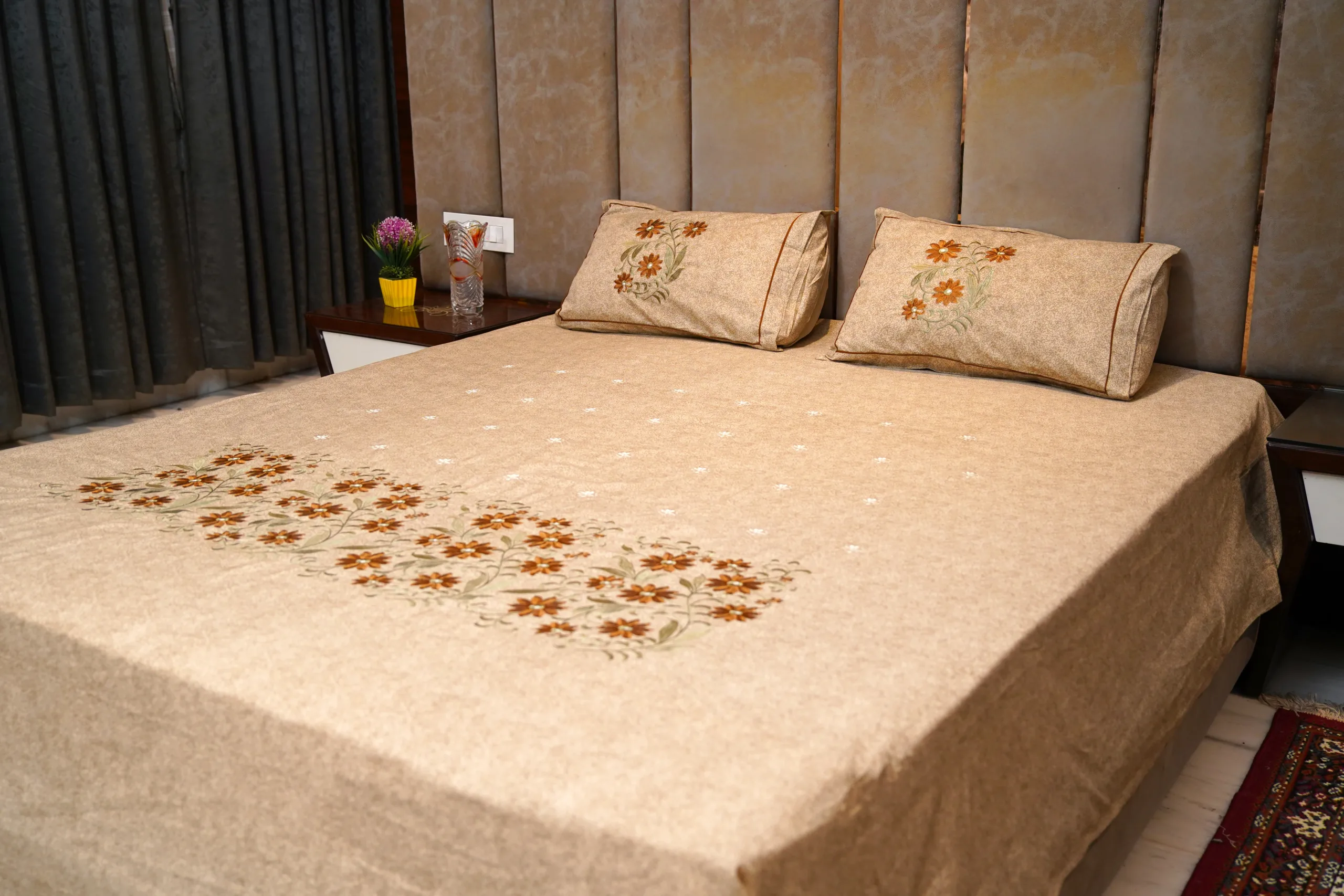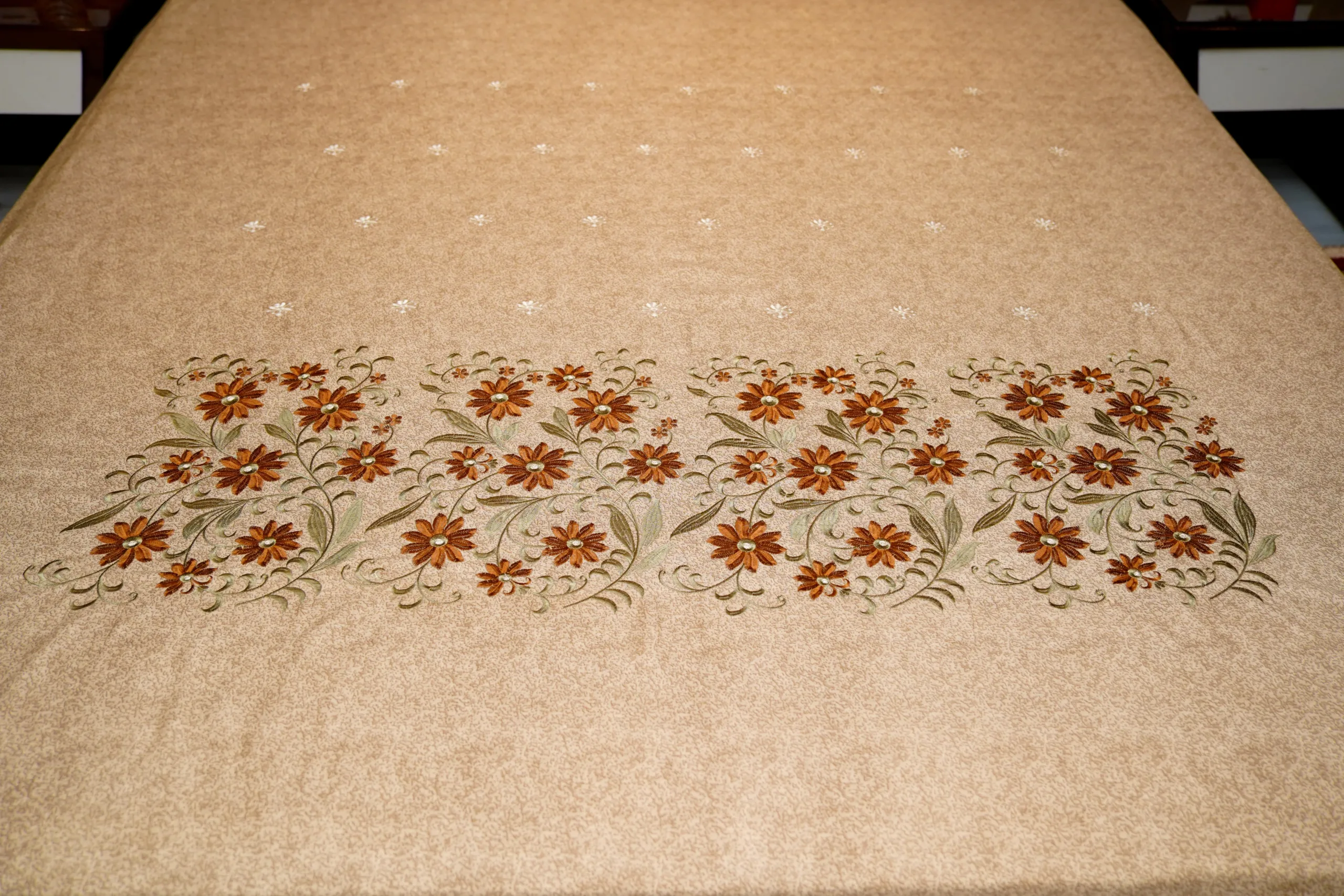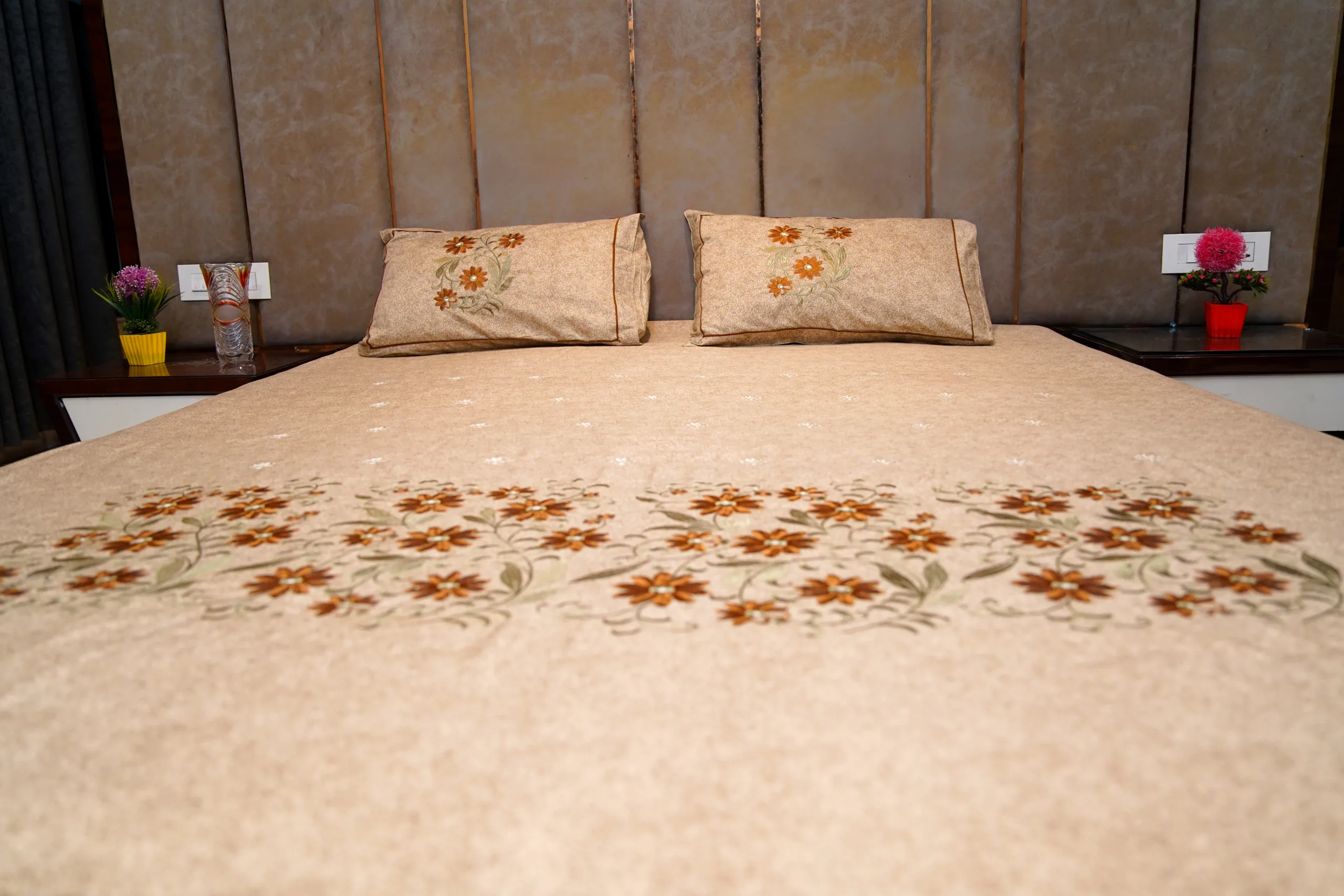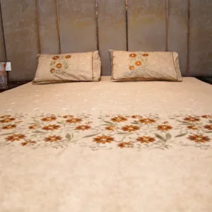 This king-size bedsheet, crafted from 100% cotton, offers exceptional breathability and durability. In a soft and soothing beige tone, it is finished with a floral embroidered border and delicate embroidered clusters throughout. Combining elegance with everyday comfort, it’s an ideal choice for regular use.