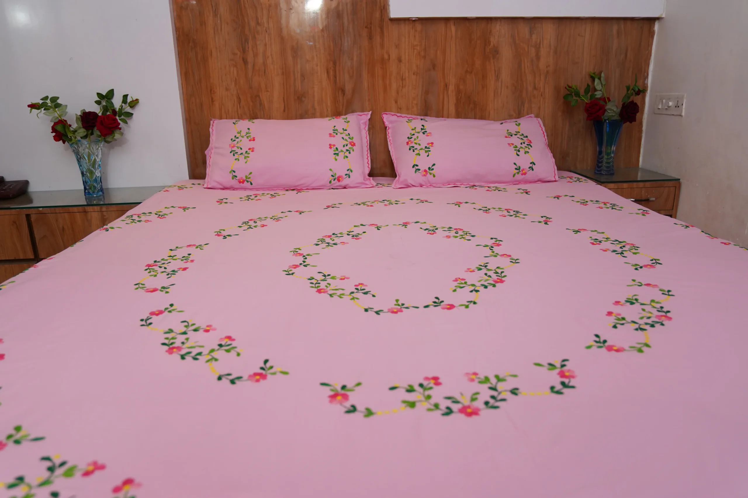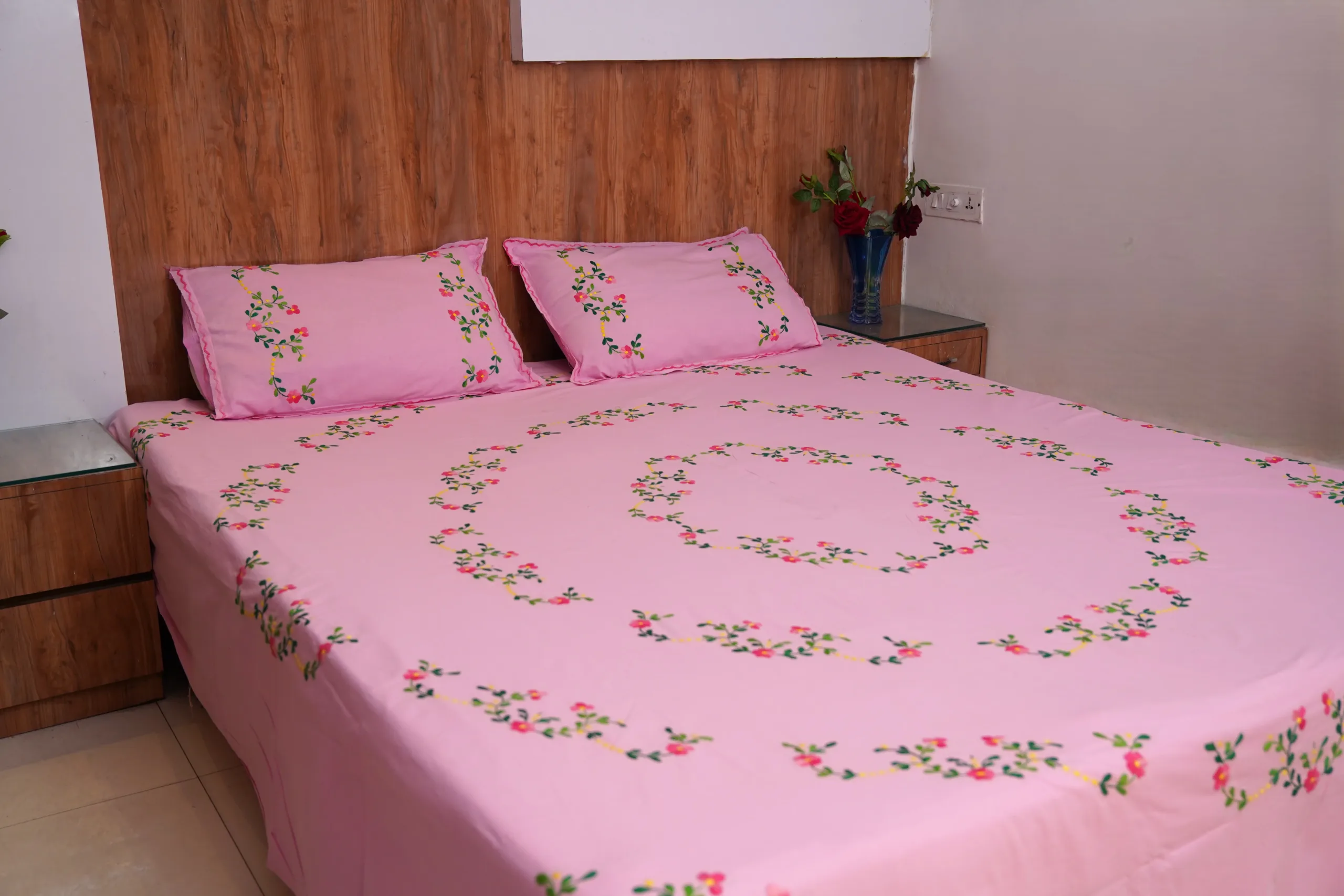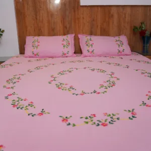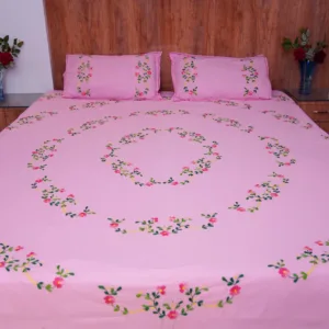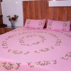 Elevate your bedroom decor with our Handwork premium pink cotton bedsheet, beautifully adorned with all-over bright pink floral embroidery. Perfect for daily use, special occasions, and bringing a touch of elegance to any space.