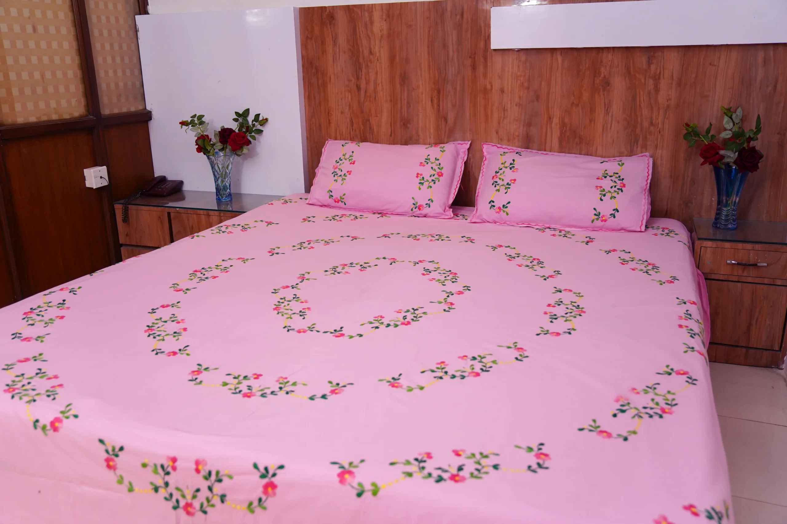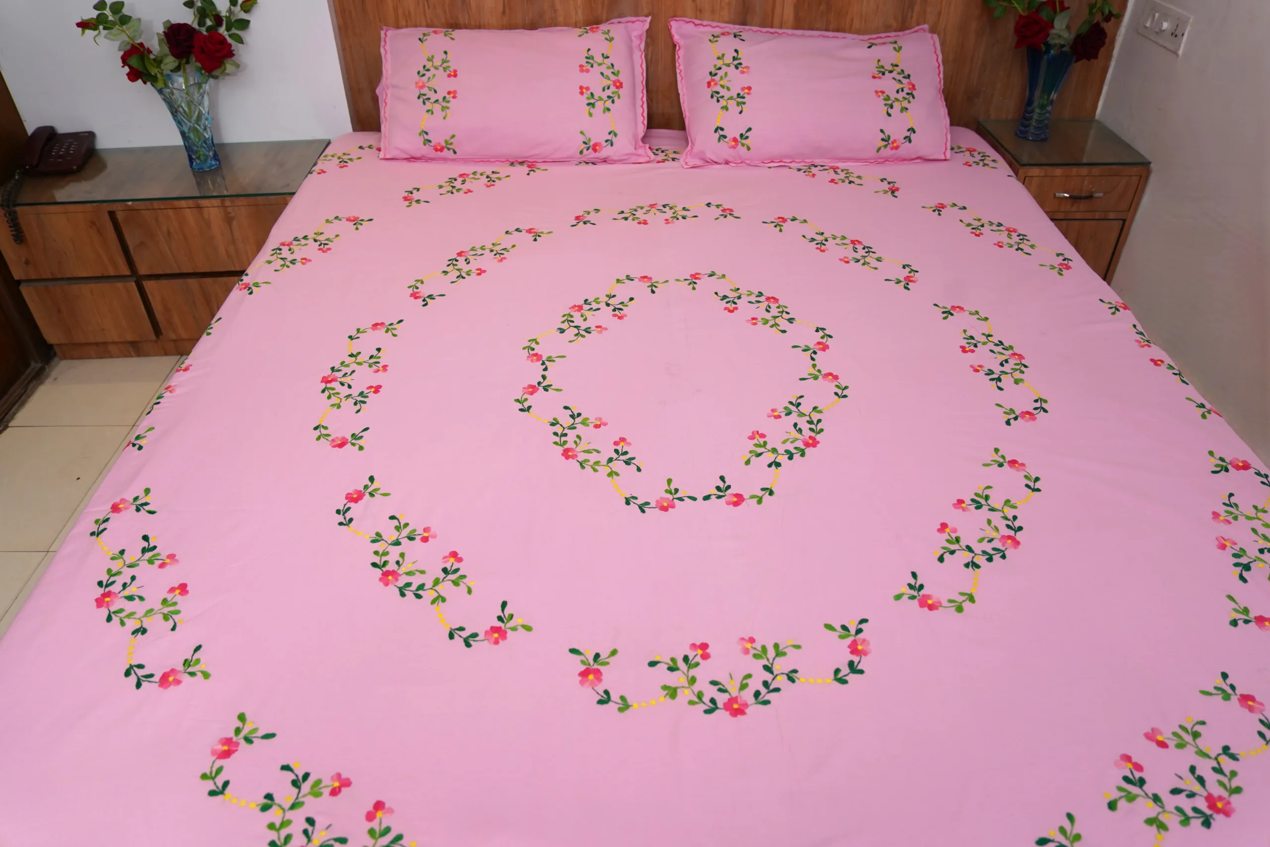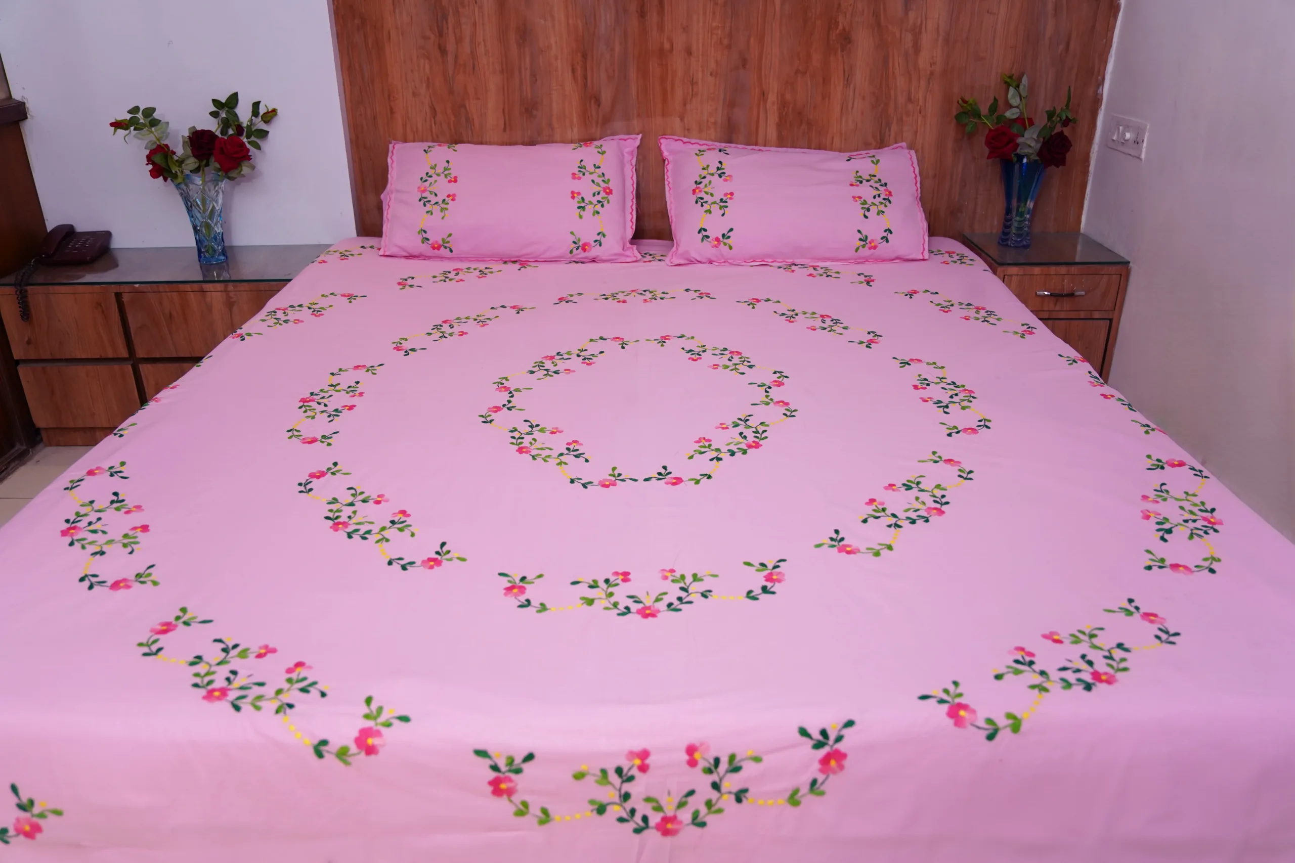 Elevate your bedroom decor with our Handwork premium pink cotton bedsheet, beautifully adorned with all-over bright pink floral embroidery. Perfect for daily use, special occasions, and bringing a touch of elegance to any space.