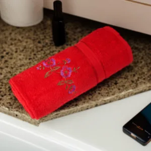 Made from 100% cotton, these red towels feature beautiful floral-designed embroidery along the edges. These towels are durable and highly absorbent. With long-lasting, vibrant colors and intricate embroidery, they retain their fresh look while adding a stylish touch to any bathroom.