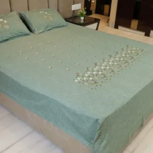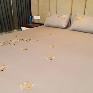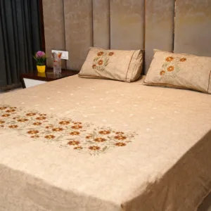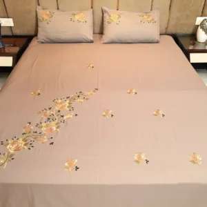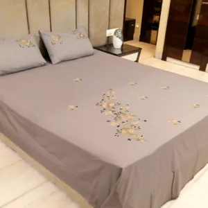 Enhance your bedroom décor with our premium cotton bedsheet in a luxurious silver shade, elegantly adorned with gold floral-patterned embroidery. Making it perfect for special occasions or adding a touch of sophistication to your daily living.