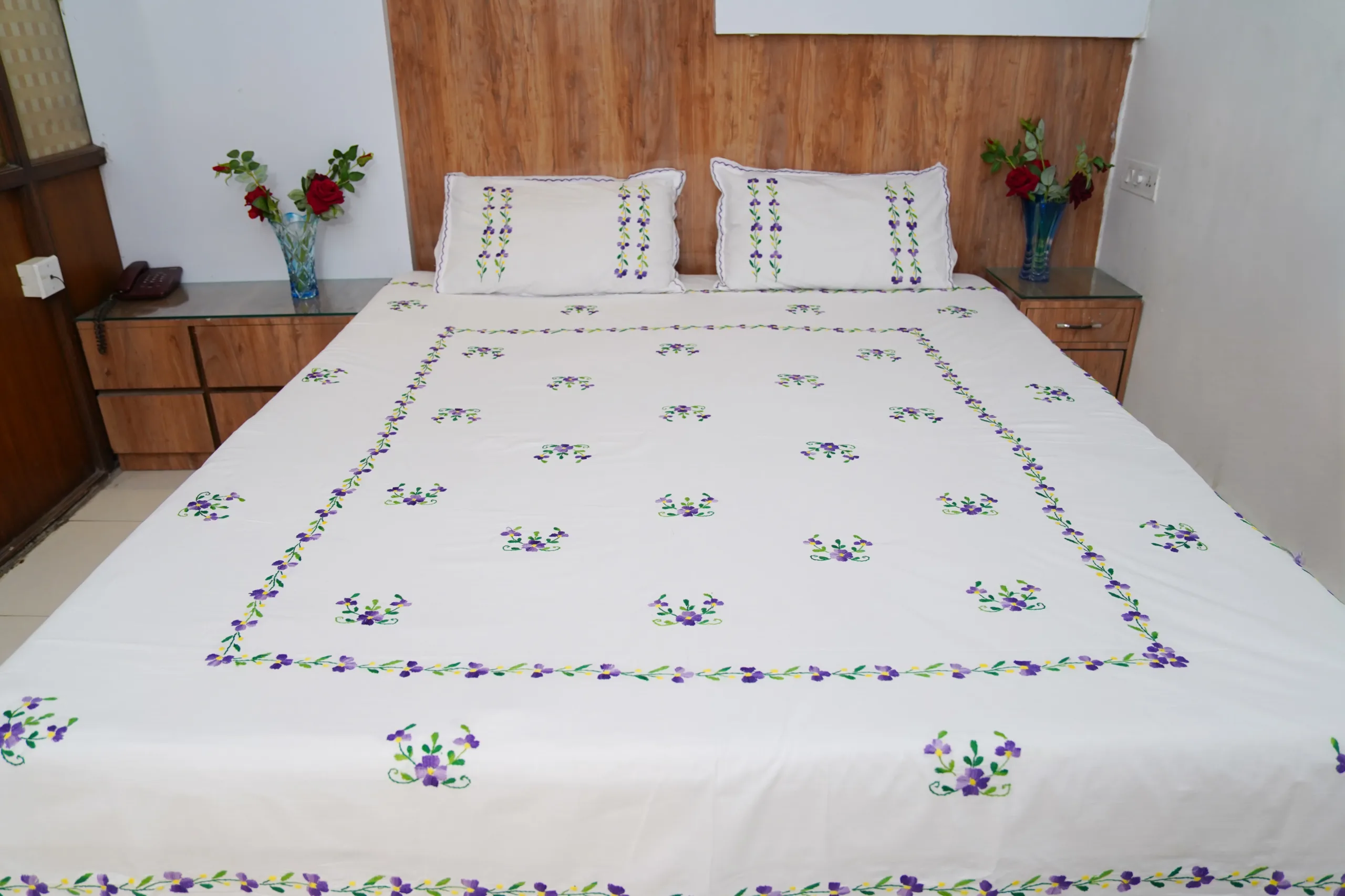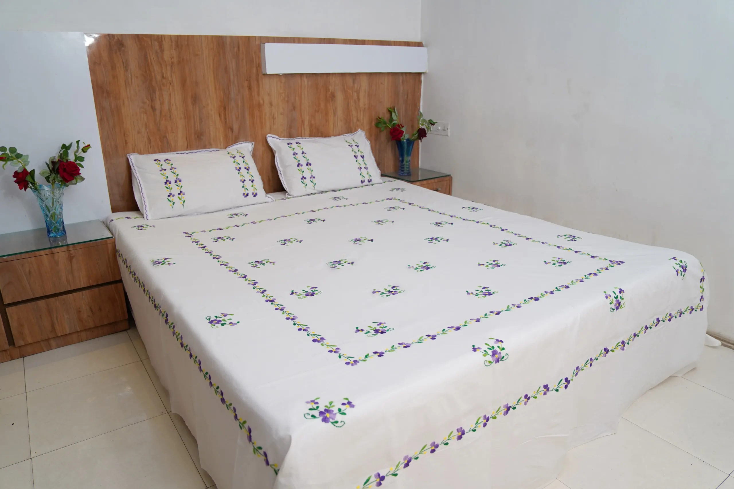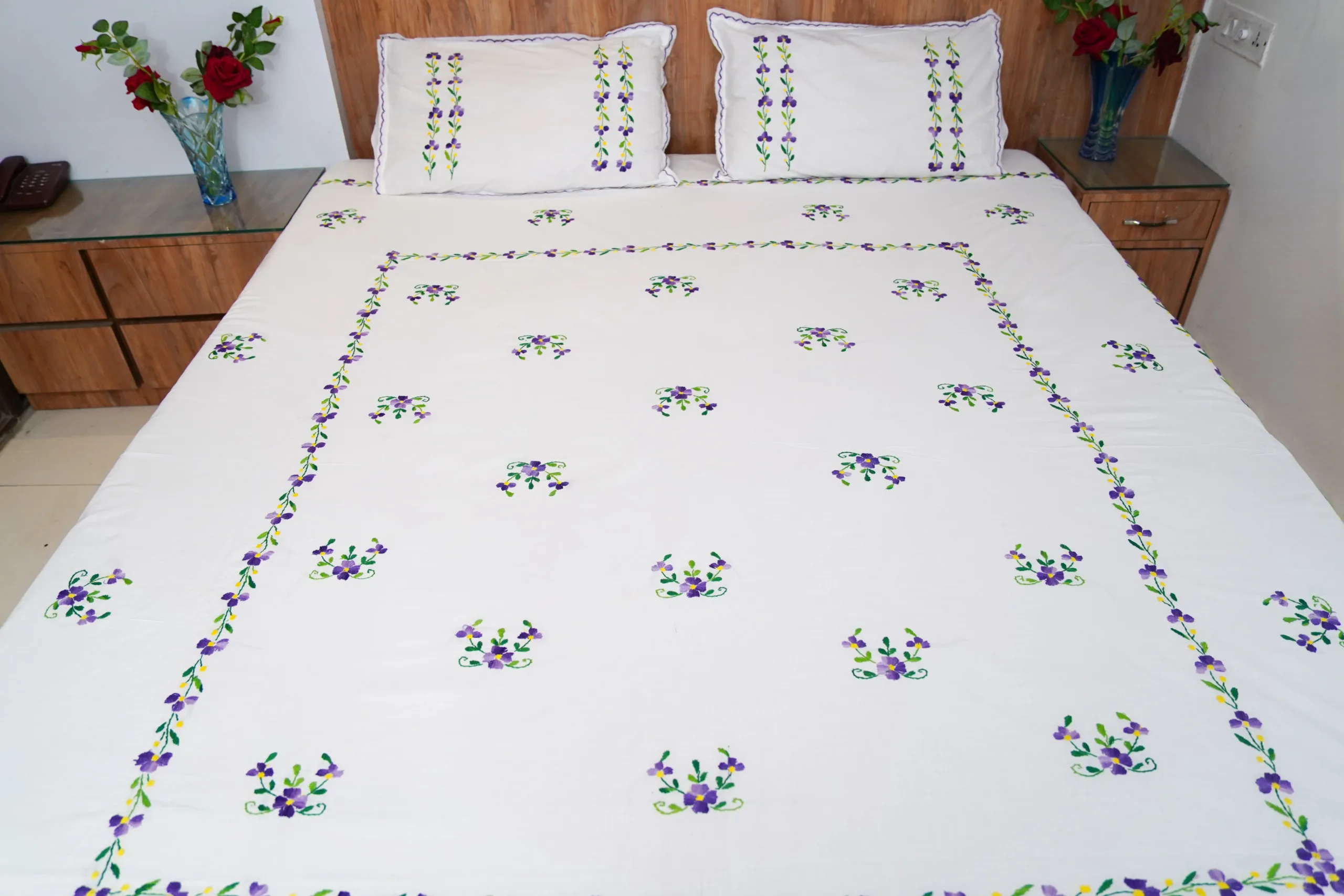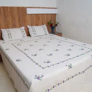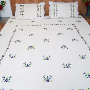 Elevate your bedroom decor with our Handwork premium white cotton bedsheet, beautifully adorned with all-over purple floral embroidery. Perfect for daily use and special occasions, it adds a touch of sophistication while creating a calm and soothing ambiance.