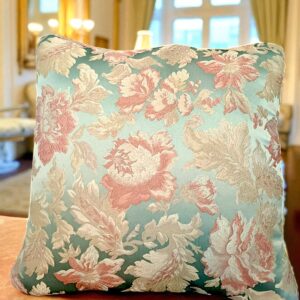 Teal Floral Embroidered Cushion Cover. Crafted from silken, shiny fabric that radiates elegance, this cushion cover features exquisite gold and rose gold floral embroidery that stands out beautifully against the rich teal background. The intricate detailing and smooth texture give it a refined, luxurious look—perfect for elevating your living room, bedroom, or lounge space.